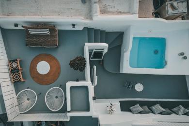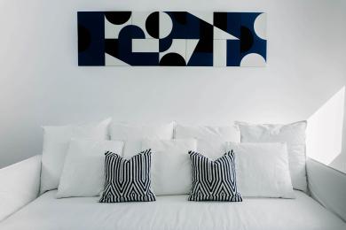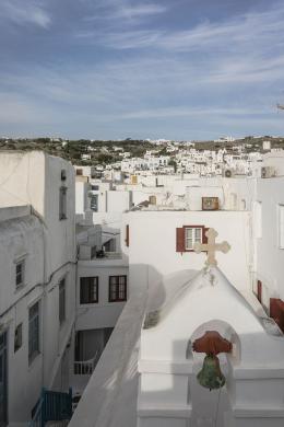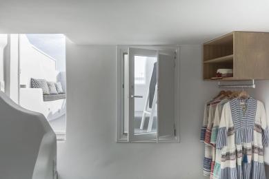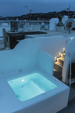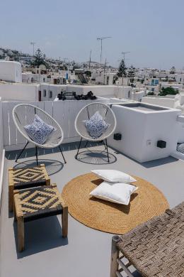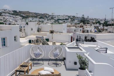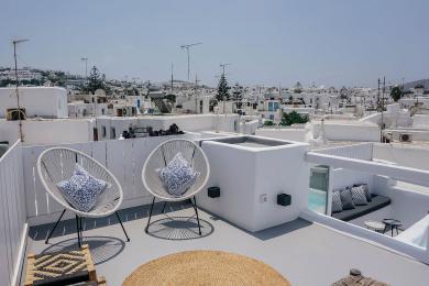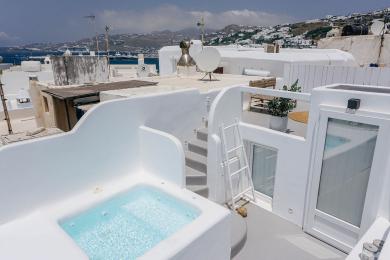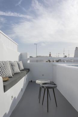 In the heart of Mykonos Old Town, this elegant 43 sqm townhouse with 25 sqm of terraces overlooks the rooftops of Chora and offers a breathtaking view of the Aegean Sea and the iconic Windmills.