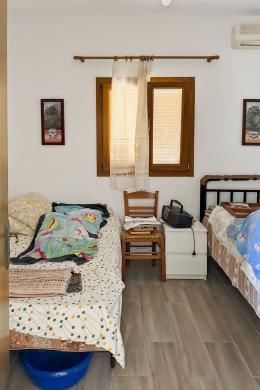 Im Inneren befinden sich zwei Schlafzimmer, ein heller Wohnbereich und eine angenehme Raumaufteilung mit Zugang zu einer Terrasse mit Blick auf die Ägäis — der perfekte Ort zum Entspannen und Genießen der goldenen Abendstunden.
