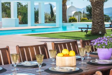 The villa's white exterior creates a serene atmosphere, perfect for relaxation. Each room offers the soothing sound of the sea, making it an ideal retreat for those seeking peace and meditation.