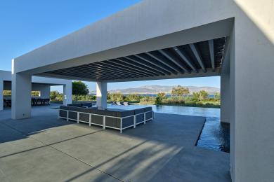 The highlight of the outdoor area is the stunning infinity pool, which encircles the outdoor terrace and invites guests to take a refreshing dip. It offers panoramic views of the Aegean Sea and the island of Paros. Surrounding sun loungers and shaded areas provide perfect spots for relaxation.