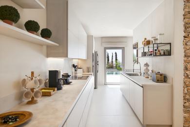 Outdoors, an infinity pool, landscaped gardens with olive trees and native Mediterranean flora, sun terraces and shaded pergolas create a serene setting for relaxation and refined outdoor living.