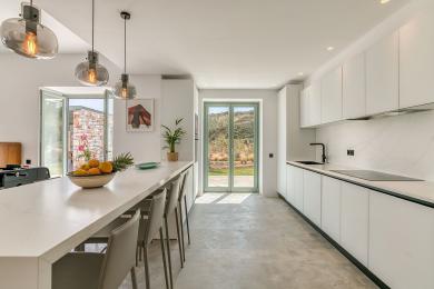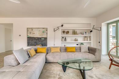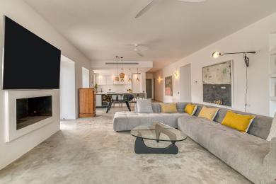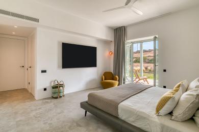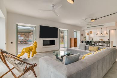 Édifiée sur un terrain paysager de 4 500 m², la propriété de 260 m² allie harmonieusement l’architecture cycladique traditionnelle à un design contemporain et épuré.