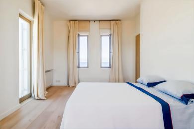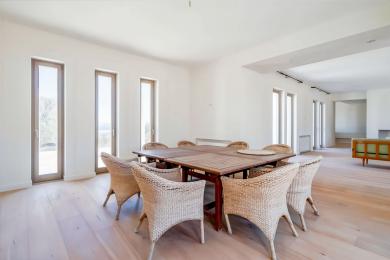 Les espaces intérieurs comprennent un vaste salon avec salle à manger, une cuisine moderne aux tons chocolat et des toilettes invités. Un escalier remarquable mène à la suite principale, disposant d’une grande terrasse privative, de nombreux rangements et d’une salle de bains élégante. Les sols en bois naturel, les huisseries de grande hauteur et les portes en bois massif témoignent du soin apporté aux finitions.